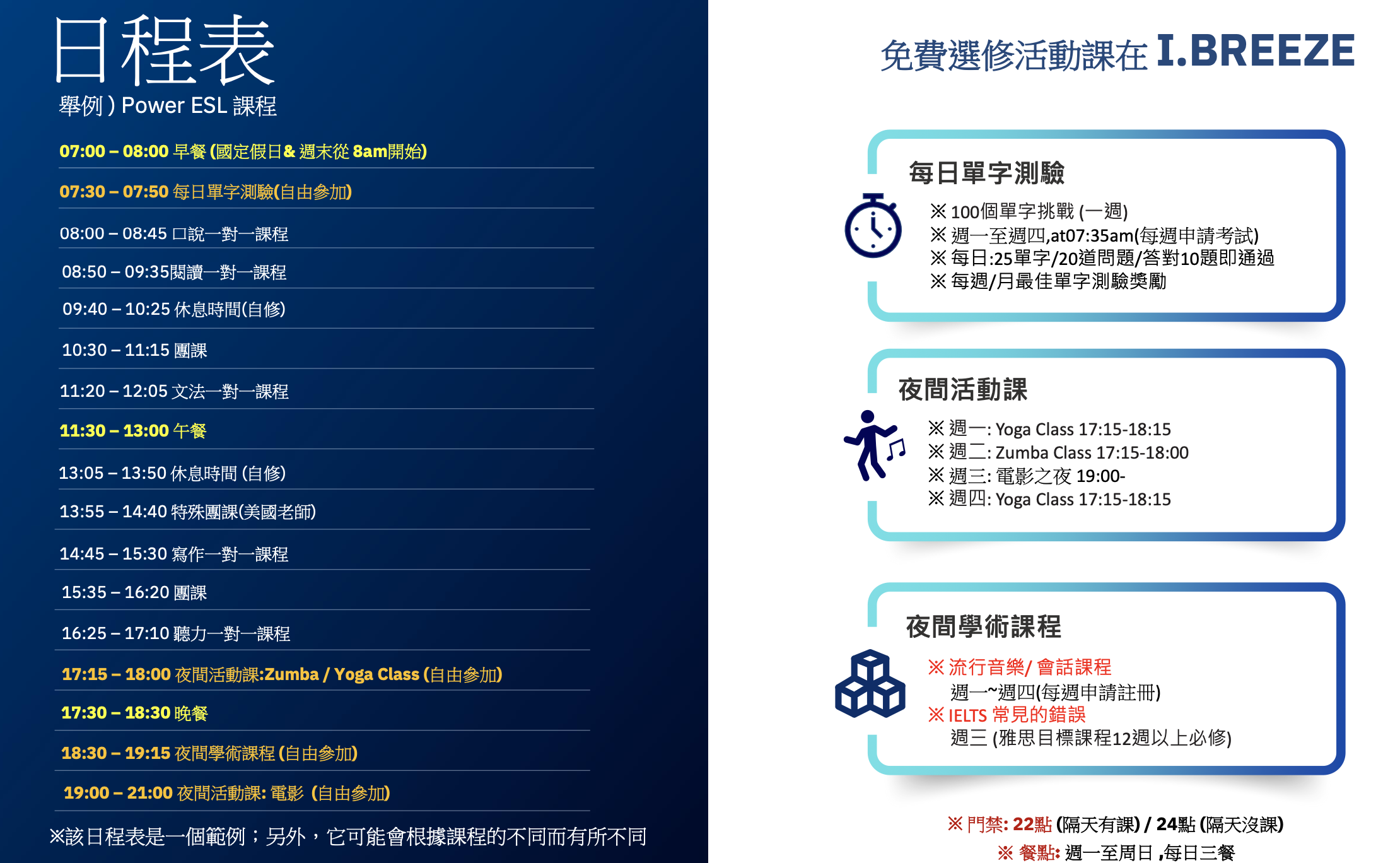 I.BREEZE 有半斯巴達管理,學校非常重視口語,有多堂1對1課程,團體課也提供給學生口語、發音的訓練。除此之外學校也提供雅思、多益、親子遊學。 - 02 – 中小規模學校 溫馨和親切的服務