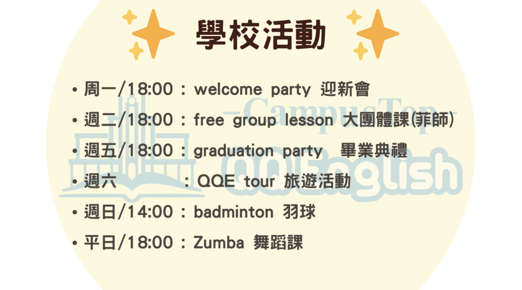 QQEnglish在2009年以線上英文平台起家,在宿霧擁有商務及海濱2大校區,是菲律賓少數同時擁有線上平台及線下校園的英文教學機構,同一批師資、同一套教材,把線下遊學與線上英文課程整合,讓學生輕鬆線上銜接到線下、線下銜接到線上,英文學習不停歇。